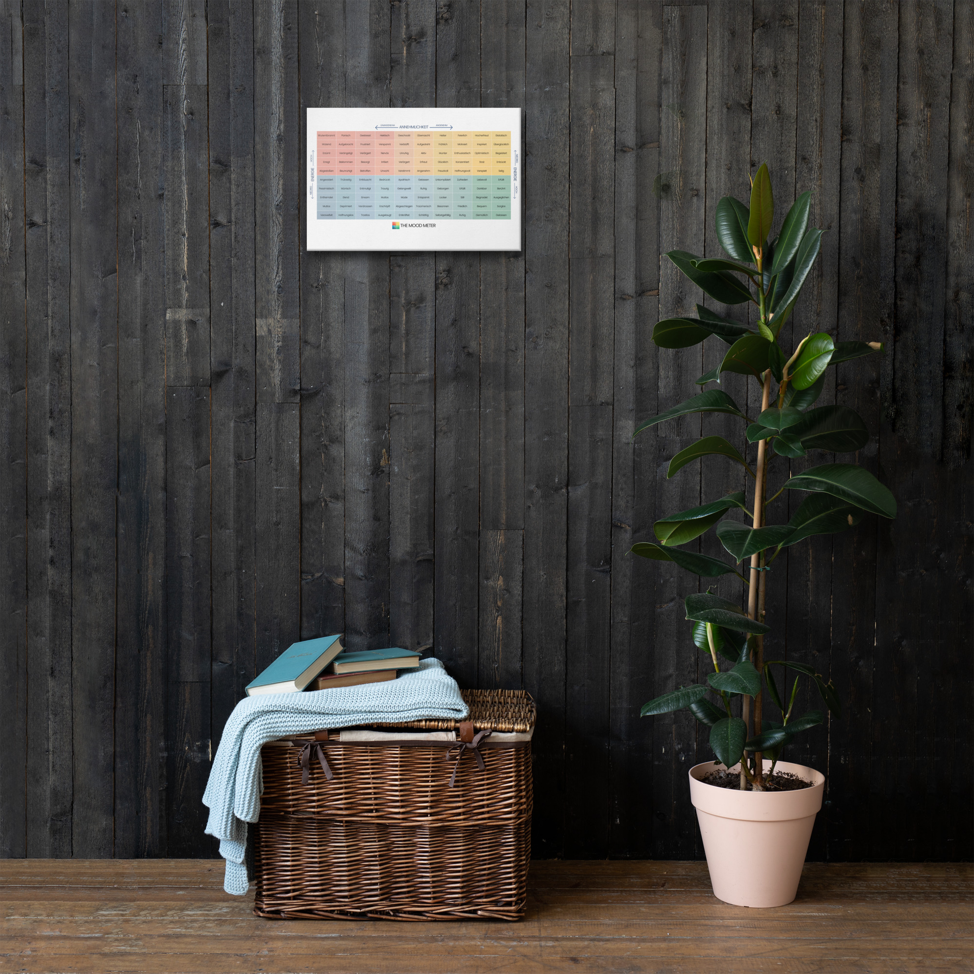 Anders als schrille Wanddeko lädt die Mood Meter Leinwand durch ihr ausgewogenes Farbschema zur achtsamen Beobachtung des eigenen Zustands ein. Sie wirkt beruhigend, ordnend und gleichzeitig aktivierend. Die visuelle Darstellung von emotionalen Zuständen wirkt unbewusst strukturierend und kann helfen, im Laufe des Tages kleine emotionale Justierungen vorzunehmen.