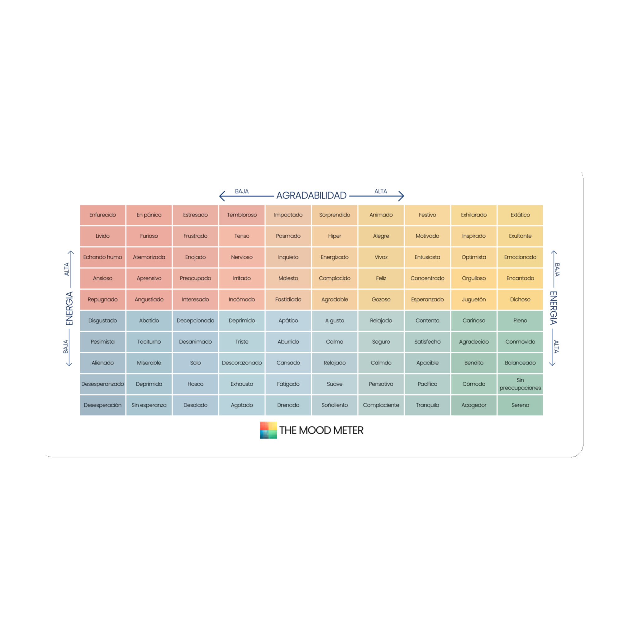 El diseño del Imán del Medidor del Estado de Ánimo en Español está inspirado en el modelo Mood Meter, una herramienta creada para ayudarte a reconocer y etiquetar tus emociones con precisión. Cada color representa una combinación única de energía y estado emocional, recordándonos que todas las emociones —ya sean agradables o desafiantes— tienen un propósito y merecen ser reconocidas.