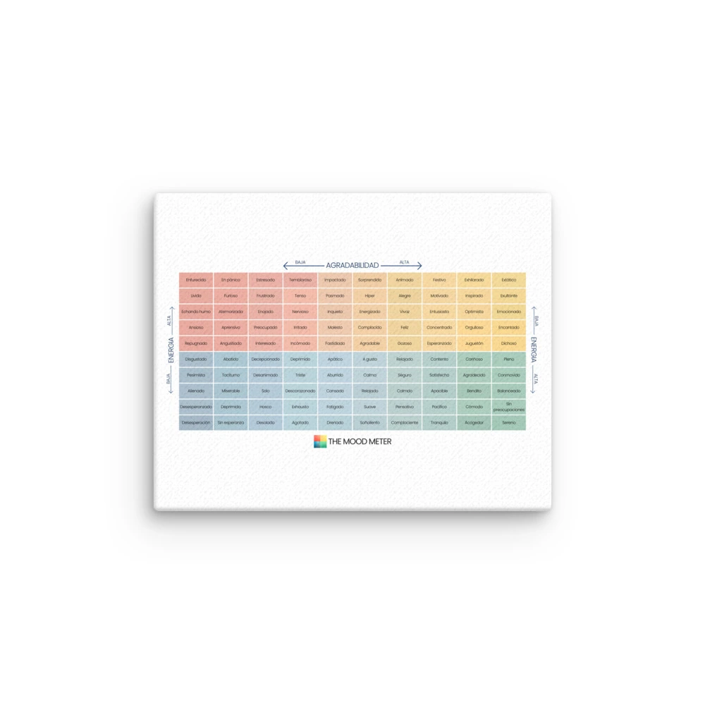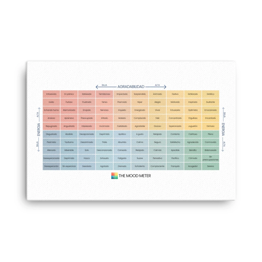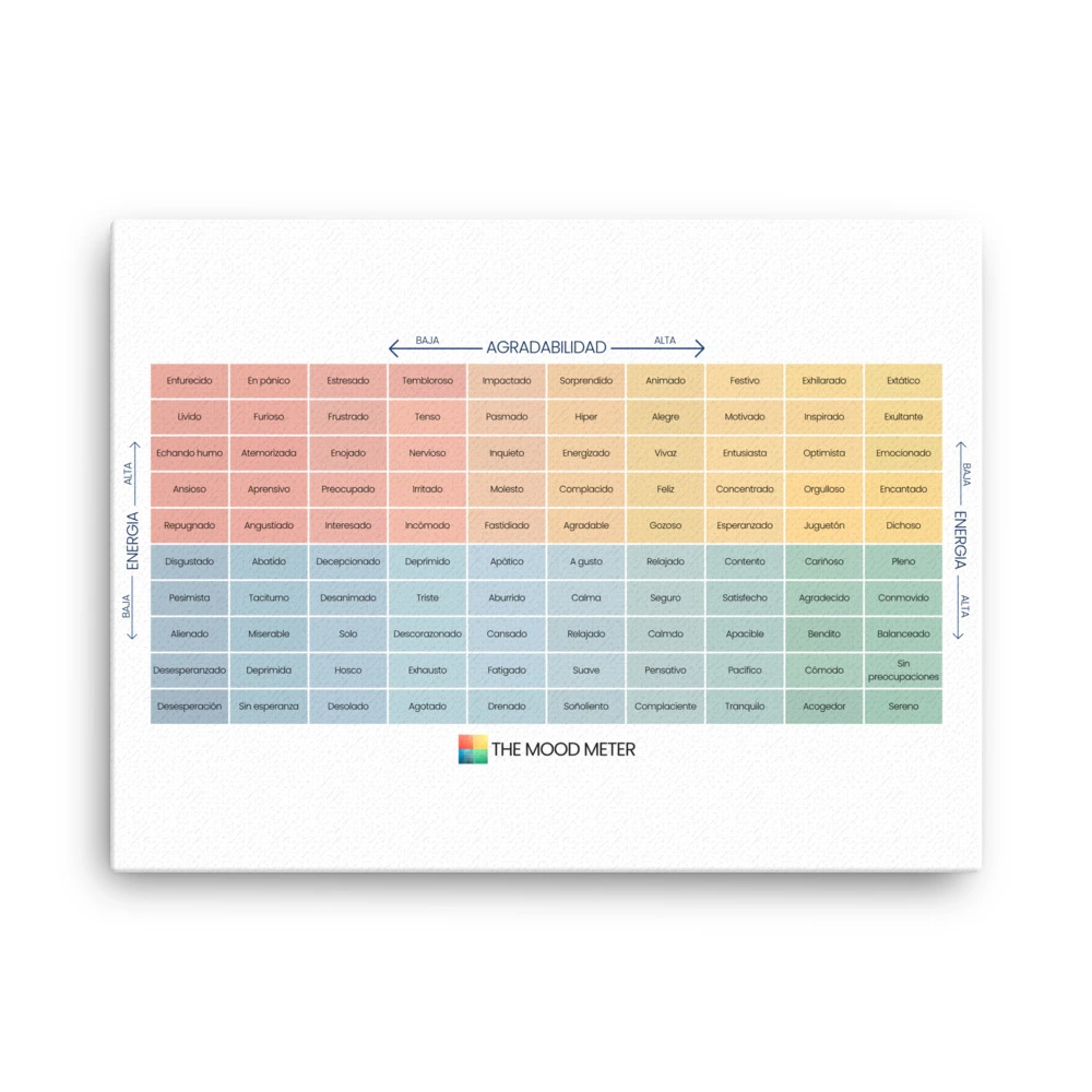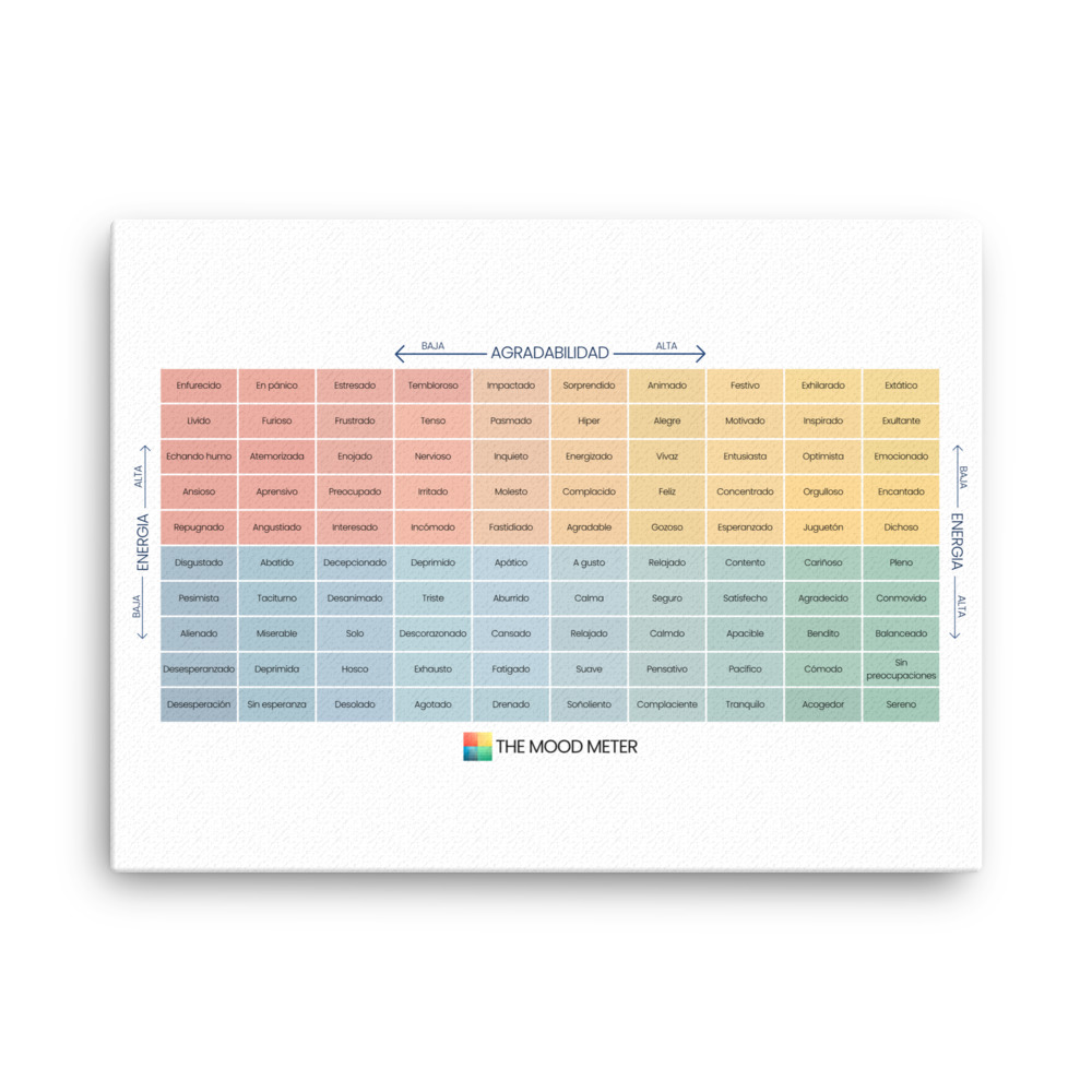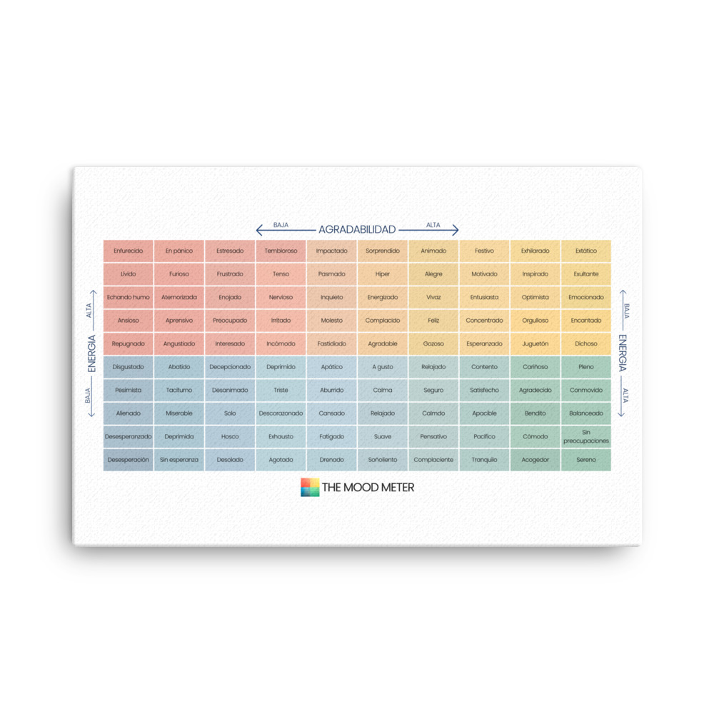El Spanish Mood Meter divide las emociones en cuatro cuadrantes de color, ayudando a identificar cómo se sienten las personas en función de su energía y nivel de satisfacción. Al exhibirlo en un lienzo de alta calidad, se transforma en un punto focal de conversación, aprendizaje y bienestar emocional.