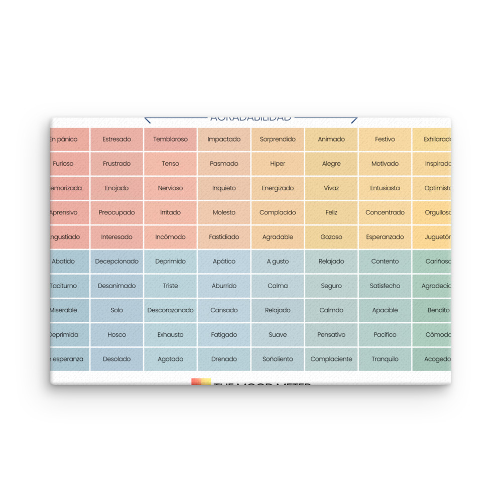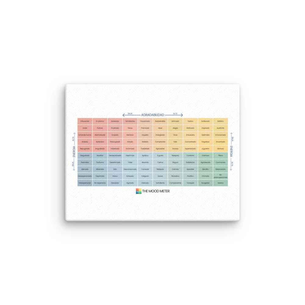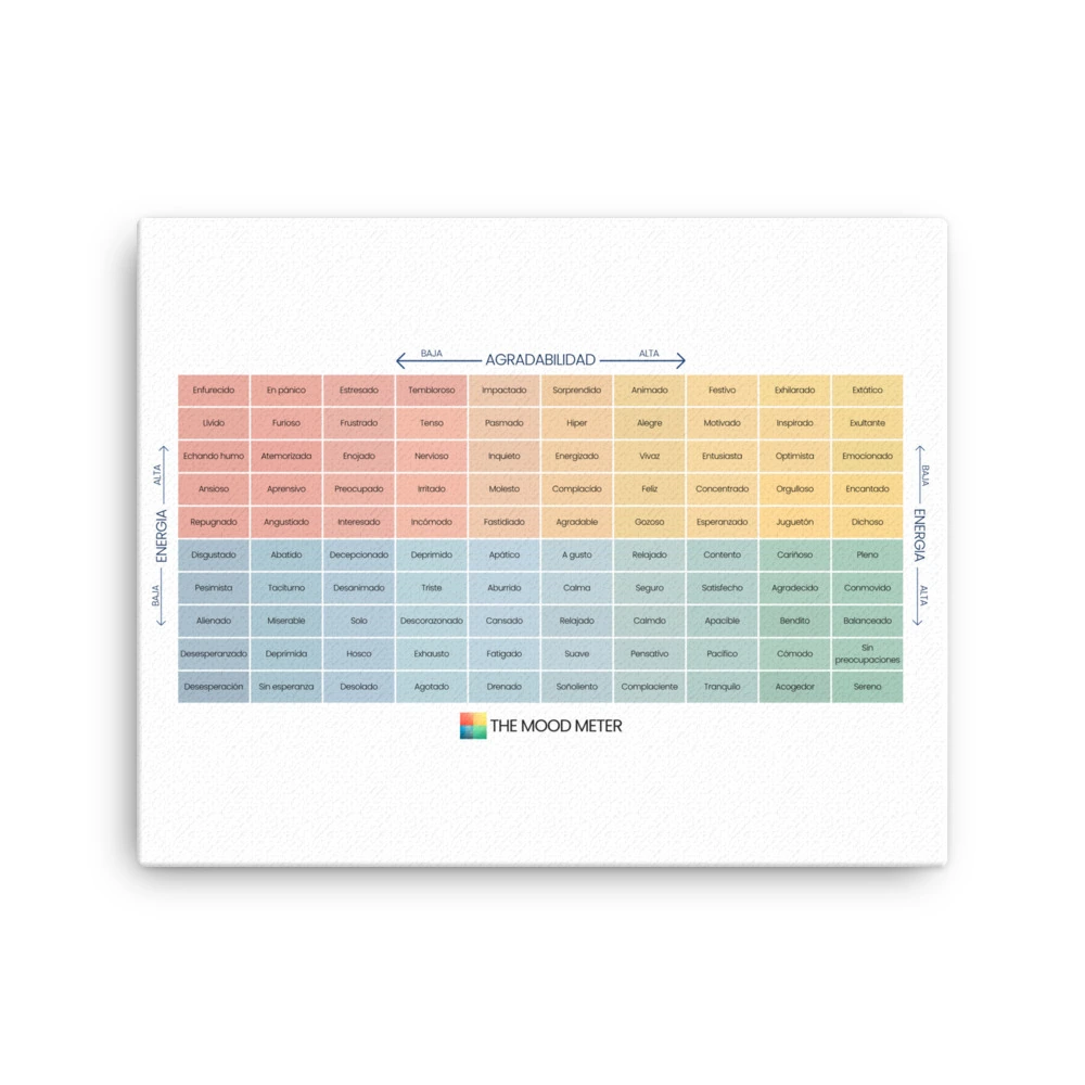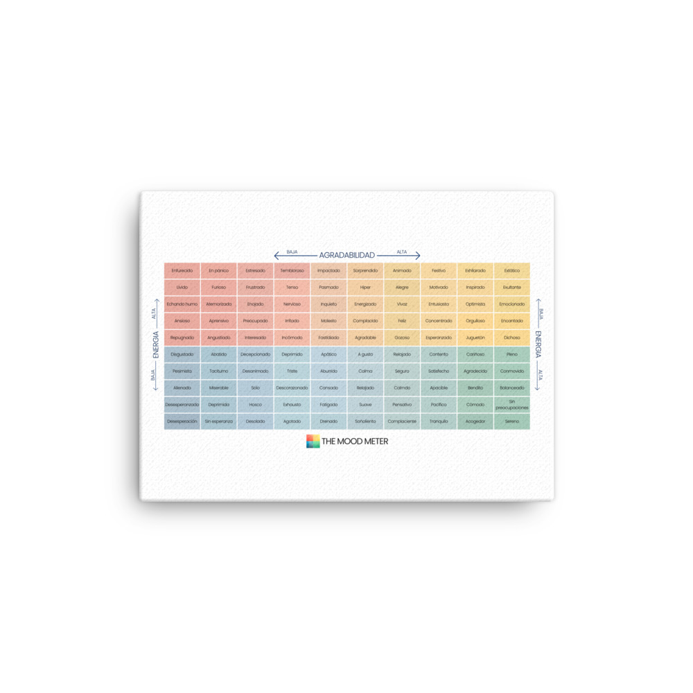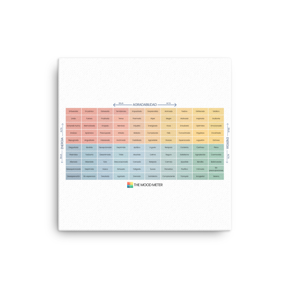 El Spanish Mood Meter divide las emociones en cuatro cuadrantes de color, ayudando a identificar cómo se sienten las personas en función de su energía y nivel de satisfacción. Al exhibirlo en un lienzo de alta calidad, se transforma en un punto focal de conversación, aprendizaje y bienestar emocional.
