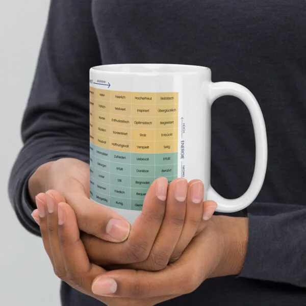 Die Tasse besteht aus robuster Keramik, die für ihre Langlebigkeit und Temperaturbeständigkeit bekannt ist. Das glänzende Finish sorgt dafür, dass der Druck besonders lebendig, farbintensiv und hochwertig wirkt. Die Mood Meter Grafik zeichnet sich durch klare Linien und kräftige Farben aus, die auch nach häufigem Gebrauch nicht verblassen. Dies macht die Tasse nicht nur zum praktischen Alltagsgegenstand, sondern auch zu einem stilvollen Deko-Element für die Küche, das Büro oder deinen Arbeitsplatz.
