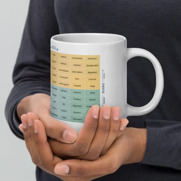 Das Mood Meter Design unterstützt dich dabei, bewusster mit deinen Emotionen umzugehen und deine Stimmung im Alltag zu reflektieren. Jede Farbe symbolisiert einen bestimmten emotionalen Bereich und erinnert dich daran, deine Gefühle klarer wahrzunehmen – egal, ob du deinen Arbeitstag planst, kreative Ideen entwickelst oder einen ruhigen Moment der Entspannung genießt. So wird die Tasse zu einem kleinen, aber wertvollen Werkzeug für emotionale Balance und Selbstreflexion.