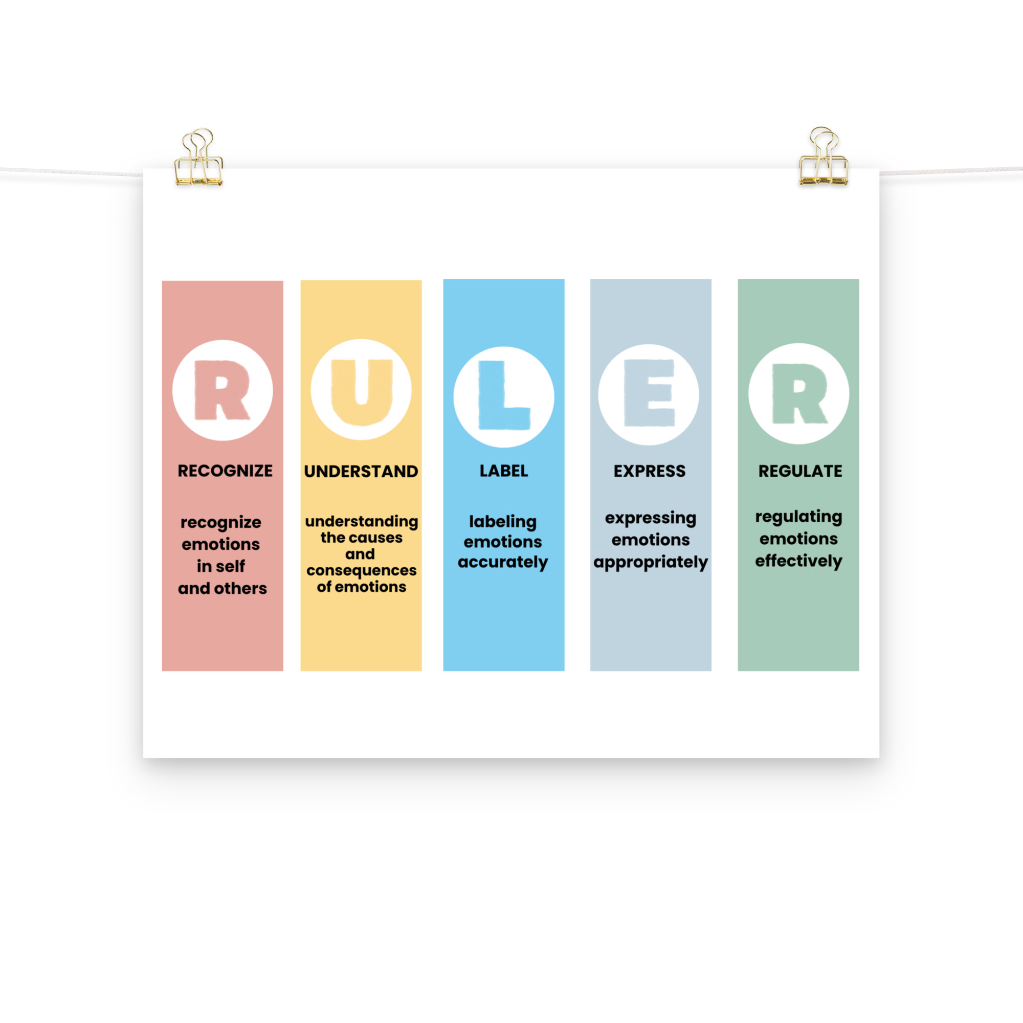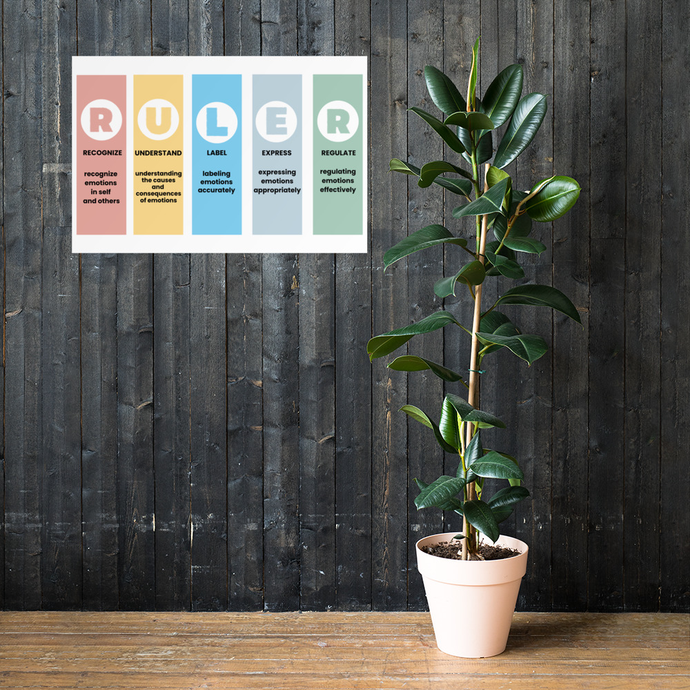 Turn your walls into a reflection of mindfulness, balance, and creativity with the RULER Photo Paper Poster — a premium-quality print designed to elevate any space. Whether displayed in your home, classroom, or workspace, this poster blends sophistication with emotional expression, embodying the essence of the RULER framework: Recognizing, Understanding, Labeling, Expressing, and Regulating emotions.