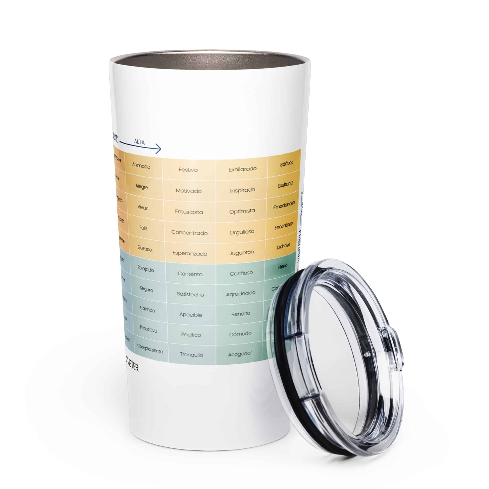 La conexión con tus emociones no debe quedarse en una sesión de reflexión. El Medidor de Estado de Ánimo, con su icónico diseño de colores basados en la matriz emocional RULER, ahora te acompaña también en formato de vaso portátil. Los colores del medidor no son solo decorativos: representan emociones reales como entusiasmo, calma, frustración o serenidad —ayudándote a mantenerte consciente de cómo te sientes durante el día.